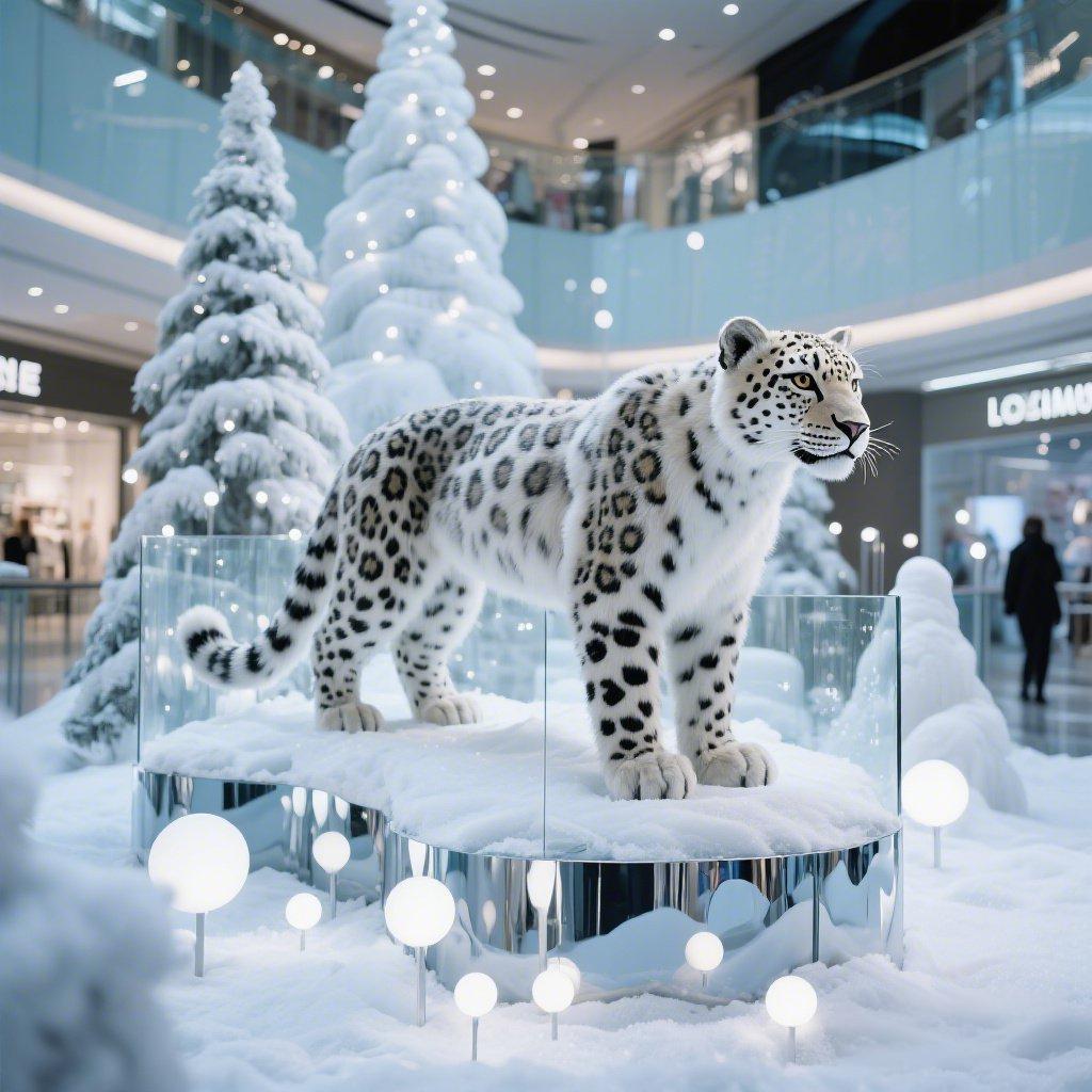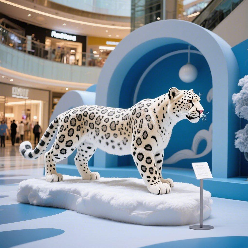 在商业空间设计日益内卷的当下,商场美陈早已突破传统装饰的边界,成为承载艺术表达与商业价值的复合型载体。本文将以商场近期推出的仿真雪豹主题美陈为例,深度解析汇龙堂团队如何通过数字技术与实体场景的融合,打造出兼具生态美学与流量密码的节日艺术装置。