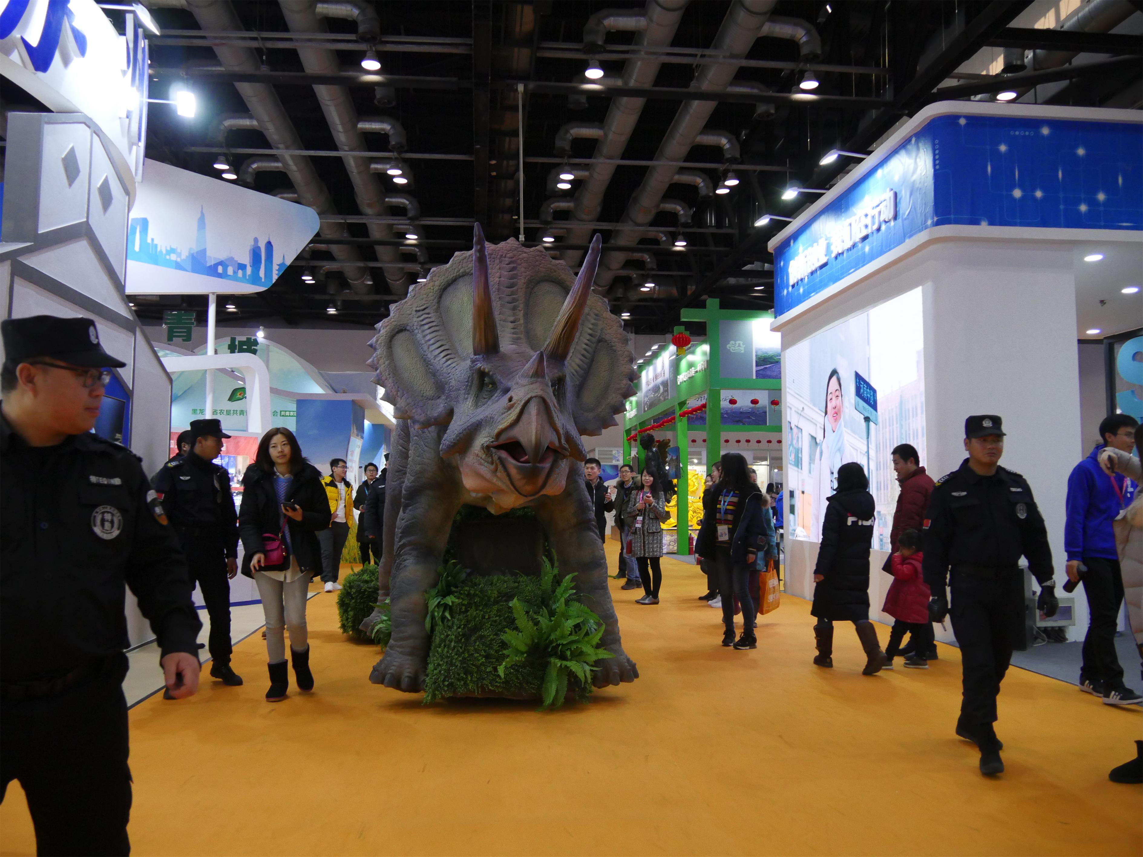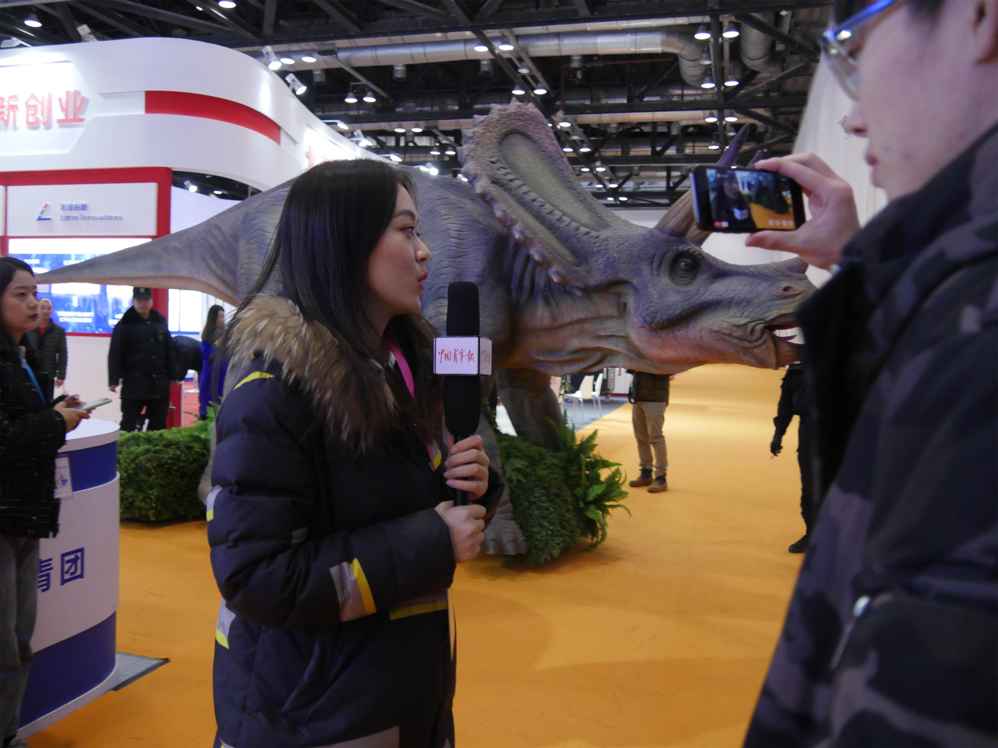 来自汇龙堂文化艺术的工作人员在创博会现场(国家会议中心)进行了演示,并向中青网记者详细介绍了汇龙堂文化艺术近年来开展产品创新研发的情况和行走仿真恐龙的产品特色。