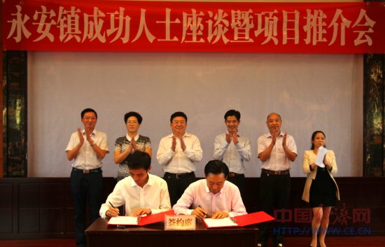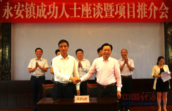 中国经济网自贡10月5日讯(记者 李远驰 江楠)中国经济网记者从自贡市沿滩区永安镇政府获悉,9月30日,在熙园山院召开的永安镇成功人士座谈会暨项目推介会上,镇长缪体强代表镇人民政府,分别与四位客商代表在合作协议书上签字,成功签约项目4个,引进资金亿元。中共沿滩区委书记邹天才,区人大常委会主任黄翠梅,区委副书记、区长黄雪智,政协主席王朝华,区委副书记杨斌,永安镇党委书记张英等领导共同出席项目推介会并见证签约。