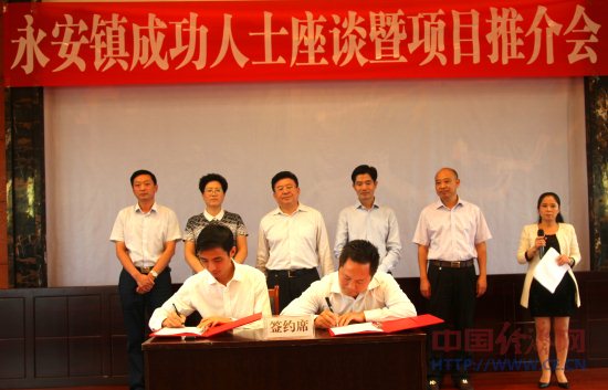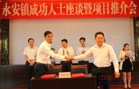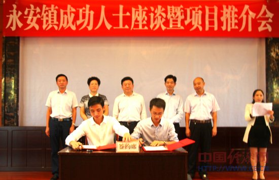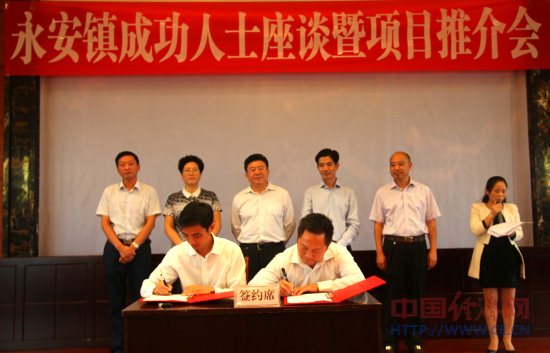 在当天的投资推介会上,永安镇人民政府镇长缪体强分别与永安建筑公司董事长熊世明,自贡市汇龙堂文化艺术有限公司总经理杨世平等签订了总投资1亿元的合作项目。包括总投资1000万元,能容纳200位老人的生态农业、老年养生、旅游观光的康疗中心。总投资2000万元,发展占地1000亩的无花果基地。总投资3000万元的永安特色养殖基地。以及引进自贡市汇龙堂文化艺术有限公司计划总投资3000万元,建设占地100亩的永安仿真恐龙旅游观光园。四个项目的同时签约,将为永安经济的发展再添新砖。