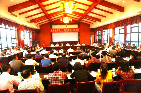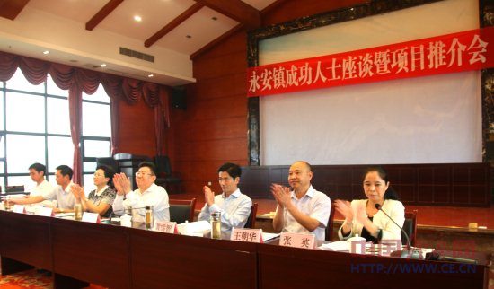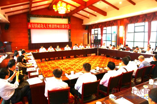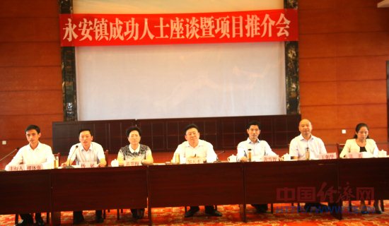 在成功人士座谈暨项目推介会上,永安镇党委书记张英致欢迎辞。永安镇位于内宜高速公路金银湖出口处,地处王(井)舒(坪)路中段,距离市区仅16公里,距离沿滩区政府驻地仅13公里,内宜高速、自隆高速穿境而过,区位、交通优势明显,四通八达的交通十分方便、快捷。永安镇早在汉唐时期就是从益州(今成都)经叙州(今宜宾)、滇西至东南亚诸邦的“南方丝绸之路”上的一个站口,宋元时代已经形成有一定集市规模的驿站。建国后,经过改革开放的发展,永安镇已经成为自贡市著名的经济大镇,文化强镇,农业富镇。尤其是在“十二五”期间,永安镇围绕沿滩区委、区政府的“一大战略、四项重点”的思路和“五个翻番”的目标,突出产业兴镇战略,狠抓城镇基础设施建设、新农村建设、特色农业产业、基础设施四大重点工程,基础设施条件极为改观。形成了花椒、特色水产、甘蔗、花卉苗木、蛋鸡等五大类特色农业。