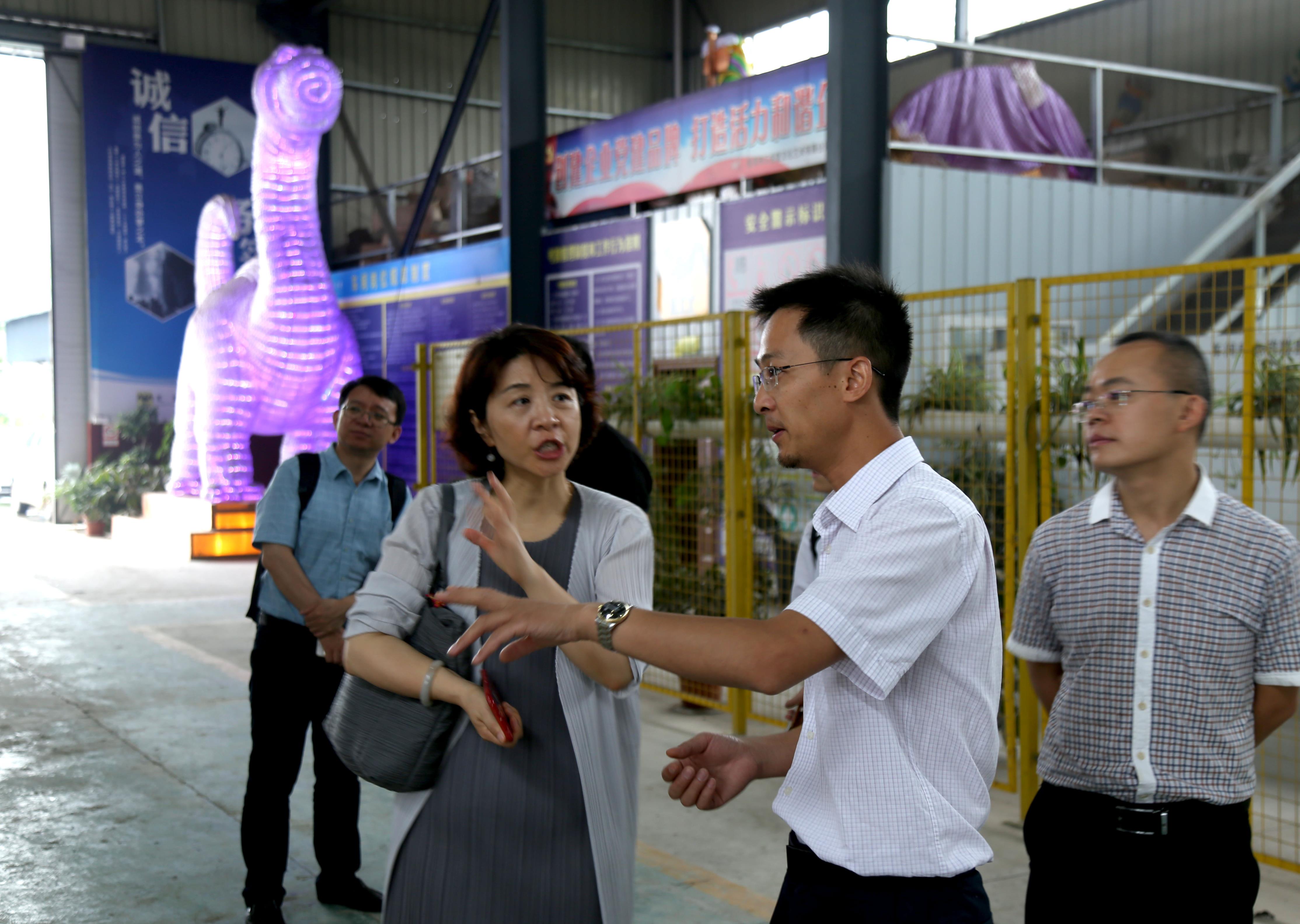 李教授及调研组在公司董事长杨世平的陪同下了解仿真恐龙园的规划建设情况,并深入生产一线了解汇龙堂最新研发、生产的相关文化艺术品,详细询问相关生产工艺和产品销售情况,随后调研组一行参观了“远古秘境”展厅和文创展厅,调研组对仿真恐龙园建设提出一些指导性的建议和意见。