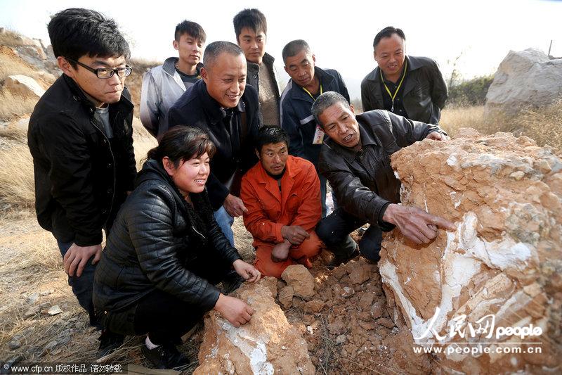 2013年11月16日,安徽省淮北市,相山区曲阳街道办事处后黄社区的村民正在元宝山查看和保管前不久发现的一具动物骨骼化石。万善朝/CFP