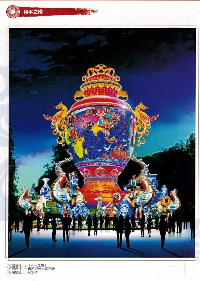 据悉,位于纪念塔的组《和平之尊》灯组取材于中国向联合国赠送的“和平之尊”,“利用现代光秀科技和新型材质,巧妙地把彩灯和制灯工艺结合,展现出‘东方之美’。”王生力说,灯组壁体加入了五大洲、四大洋等“丝绸之路”的元素,灯组用3万多个灯点,组合成块面进行光效表演,利用亚克力、PVC、平板玻纤等新型材质,使灯组透光性好,不采用任何外光源的情况下,便能达到震撼的视觉效果。