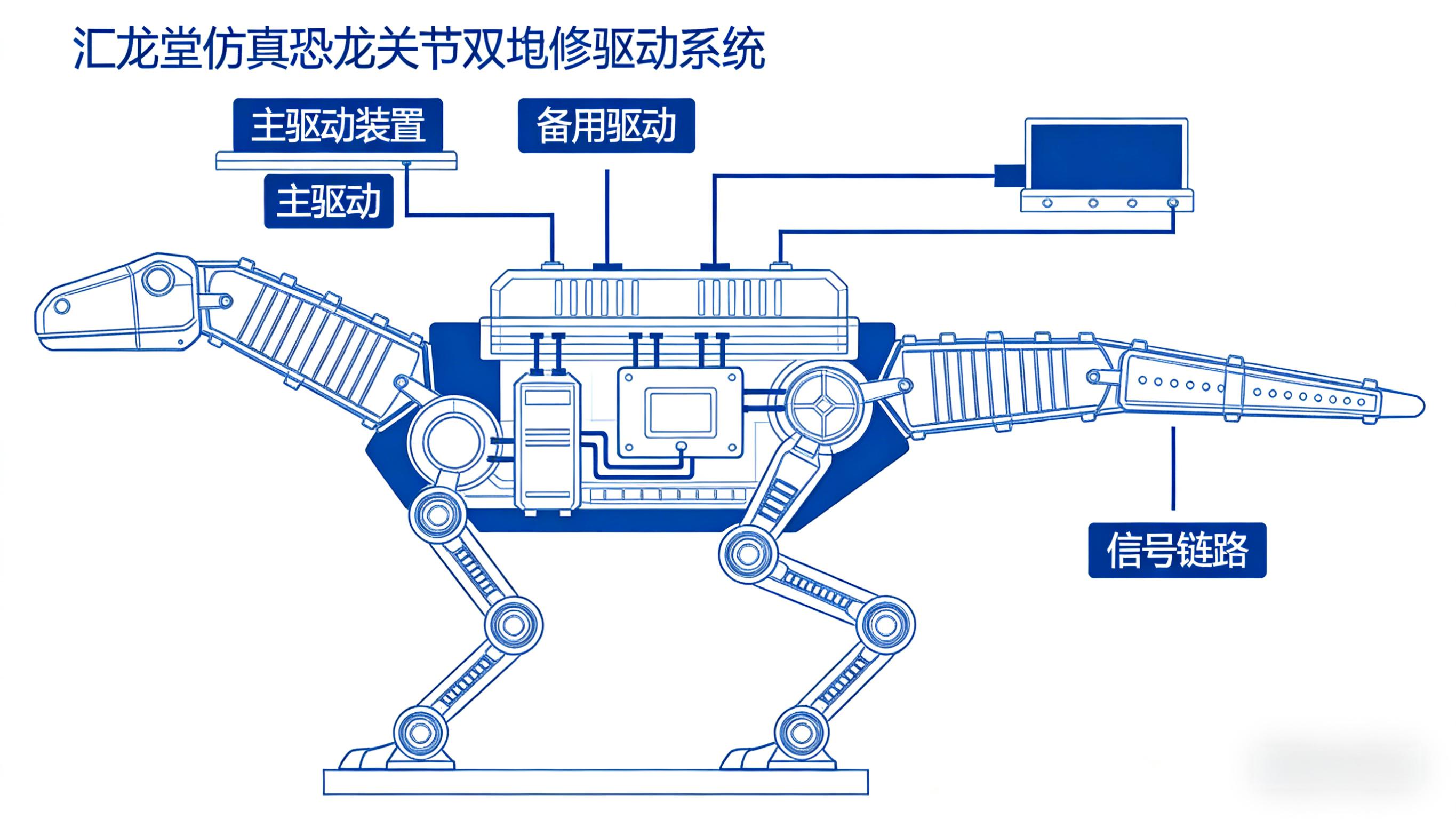 为应对户外场景的高负荷运行,汇龙堂在关键关节(如大型恐龙的颈部基部、后肢髋部)设计了 **“动力冗余 + 信号冗余”** 的双冗余系统:
